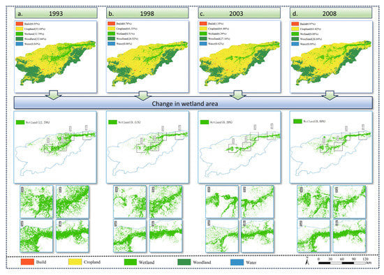 Five-year land use change map of the NLR Basin from 1993 to 2022, in which (a–d) show the land use distribution maps of 1993, 1998, 2003, and 2008, respectively, ‘1, 2, 3, 4’ are typical areas of the NLR Basin.