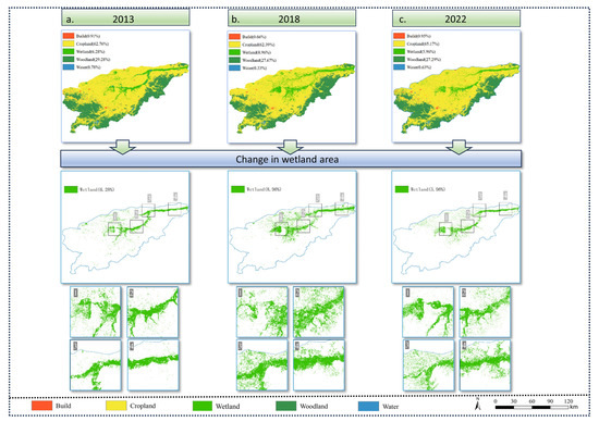 Five-year land use change map of the NLR Basin from 1993 to 2022, in which (a–c) show the land use distribution maps of 2013, 2018, and 2022, respectively, ‘1, 2, 3, 4’ are typical areas of the NLR Basin.