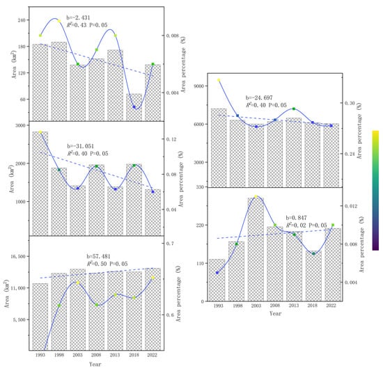 (km2) Changes in area of different land use types in the NLR Basin from 1993 to 2022. The columns represent the area percentages of different LULC types, and the dashed lines represent the linear fits of different LULC areas in the four periods.