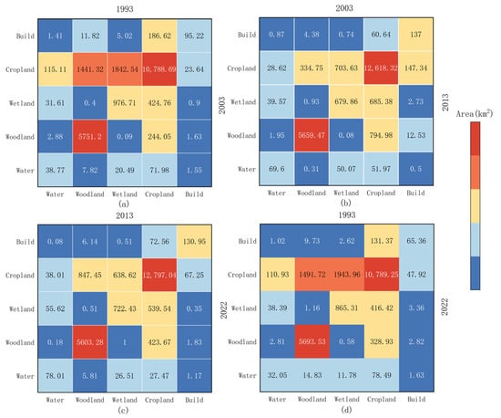 Heat map of land use transfer in the NLR Basin: (a) 1993–2003; (b) 2003–2013; (c) 2013–2022; (d) 1993–2022.
