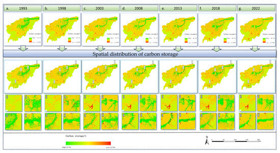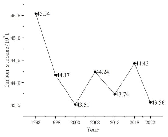 Using the carbon storage module of the InVEST model, we estimated the carbon storage of the NLR Basin in seven periods between 1993 and 2022, including 1993, 1998, 2003, 2008, 2013, 2018, and 2022 (Figure 7). The carbon storage in the study area first decreased and then increased from 1993 to 2022. Overall, the carbon storage in the basin decreased by 1.98 × 107 t from 1993 to 2022, with the most significant decline observed during 1993–2003, resulting in a decrease of 2.03 × 107 t. This decrease was mainly due to the reduction in the wetland and forest land area and the increase in the cultivated land area. However, from 2003 to 2022, the carbon storage in the basin showed a slight upward fluctuation, increasing by 0.05 × 107 t. This increase was mainly due to the implementation of the policy of returning farmland to forest land and returning farmland to wetland, which helped to restore the area of forest wetland.