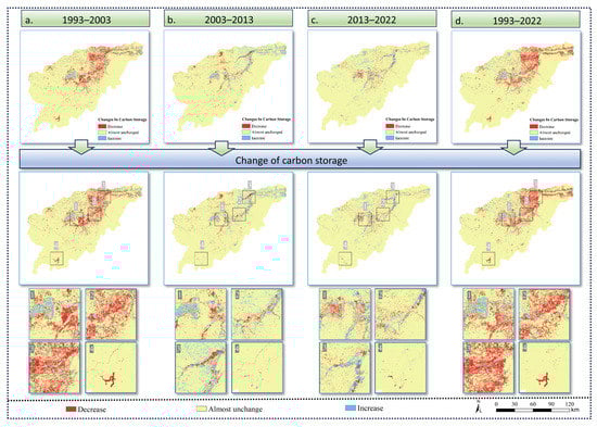 In order to better depict the changes in carbon storage in the study area, a spatial change map of carbon storage was constructed for the period of 1993–2022 by reclassifying the difference value of each decade. The spatial variation in carbon storage during this period was classified into three categories: reduction, no significant change, and increase, as shown in Figure 9. The spatial variation in carbon storage showed the characteristics of large aggregation and sporadic distribution. During the period of 1993–2003, the spatial variation in carbon storage was intense, with the increase in carbon storage mainly concentrated in the central and eastern regions of the basin. However, the carbon storage showed a sporadic distribution and mainly exhibited a decreasing trend. The area with a significant reduction in carbon storage was concentrated in the central region of the basin, where the carbon storage changed dramatically. In contrast, the spatial variation in carbon storage during the periods of 2003–2013 and 2013–2022 was relatively stable, with the area of carbon storage change mainly being concentrated in the central part of the basin near the banks of the NLR and Qixing River. The carbon storage in the other regions remained unchanged. Overall, the change in carbon storage in this basin from 1993 to 2022 was intense. The area with significant changes in carbon storage was mainly concentrated on both sides of the NLR and the Qixing River. The establishment of the NLR National Nature Reserve and the completion of water conservancy projects such as Longtou Bridge have influenced the carbon stocks in the central and northeastern regions of this region and the upper reaches of the basin to varying degrees. In addition, the expansion of cultivated land has led to the conversion of wetlands and woodlands into paddy fields and dry land, causing sporadic reductions in carbon storage in the eastern and central regions of the basin.