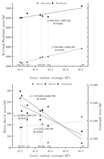 In order to explore the relationship between land use change and total carbon storage in the study area, we calculated the correlation between the LULC area change and total carbon storage from 1993 to 2022. Figure 10 shows that the total carbon storage in the study area is positively correlated with the area of wetland and forest land, since the wetland and forest land have a high carbon density, and large carbon sequestration in soil, which significantly affects regional carbon storage. Conversely, the area of cultivated land is negatively correlated with total carbon storage. Although the area of cultivated land has increased, it has mainly been converted from wetlands and woodlands with high carbon storage, resulting in a negative correlation with total carbon storage. The correlation between the area of the build and water categories and the total carbon stock is not clear. It is possible that other factors have a significant effect on the carbon stocks of these two types of land.