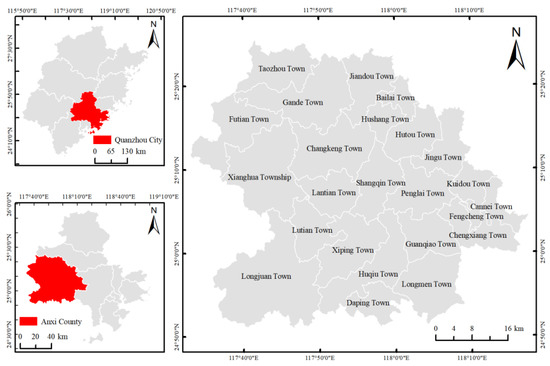 Anxi County is located in Southeastern Fujian Province (117°36′–118°17′ E, 24°50′–25°26′ N), with a total area of 3057.28 square kilometers and a total population of over 1.2 million. Anxi County is part of the southeastern extension of the Daiyun Mountains and is dominated by hilly mountainous terrain, with an average altitude of over 700 m and a peak of 1600 m. With an average annual temperature of 16–21 °C and an annual precipitation of 1800 mm, it is an excellent area for growing oolong tea and is the first of the key tea-producing counties in China, known as the “Tea Capital of China”. The tea plantation area in Anxi County is about 60,000 hectares, accounting for about 1/3 of the total tea plantation area in Fujian Province, with a tea output of 62,000 tons and a total output value of 32 billion yuan (Figure 1).