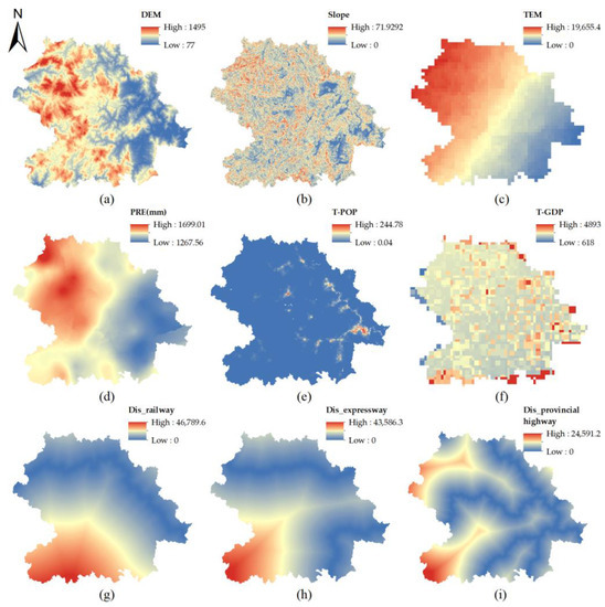 Spatial distribution of land use drivers. (a) DEM; (b) slope; (c) average annual temperature; (d) average annual precipitation; (e) tea-related population density; (f) total tea production value; (g) distance to railroad; (h) distance to highway; (i) distance to provincial road.