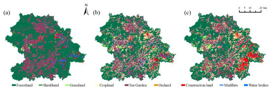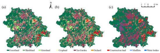 Map of land use types in the study area for 2010–2020. (a) 2010; (b) 2015; (c) 2020.