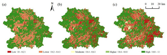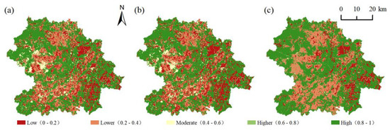 Spatial and temporal variations in habitat quality in the study area from 2010 to 2020. (a) 2010; (b) 2015; (c) 2020.