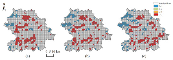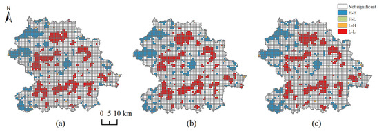 The 2010–2020 LISA maps of habitat quality in the study area. (a) 2010; (b) 2015; (c) 2020.