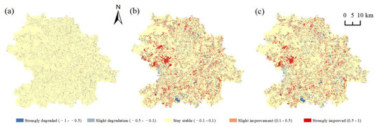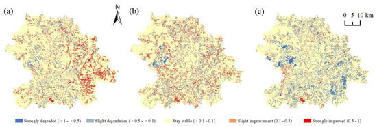 To further explore the spatial and temporal dynamics of habitat quality in the study area, the habitat quality changes were calculated for each image element and classified as strongly degraded (−1 to −0.5), slightly degraded (−0.5 to −0.1), remained stable (−0.1–0.1), slight improvement (0.1–0.5) and strong improvement (0.5–1), for a total of five classes. The results of the study showed (Figure 7 and Table 10) that the habitat quality remained stable in most areas of the study area during the 10-year period, with an area of 2232.9036 km2, accounting for 74.70% of the total area of the study area, but the improved areas were always larger than the degraded areas, the strongly improved areas were concentrated in the western part of the study area and the strongly degraded areas were concentrated in the southern part of the study area. During 2010–2015, the overall habitat quality in the study area remained stable, accounting for 91.35% of the total area of the study area, while, during 2015–2020, the area and proportion of both improved and degraded areas in the study area increased, especially the proportions of the slightly improved and strongly improved areas in the study area, which increased by 6.64% and 9.07%, respectively.