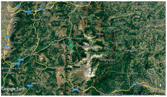 The Sibillini Mountains National Park is surrounded by a red line. The green flags indicate the study location and represent the area where the camera traps are located. Map data ©2022 Google.