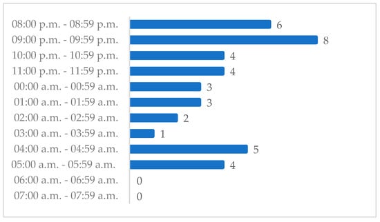 The peak of wolf activity was detected between 09:00 p.m. and 10:00 p.m. (Figure 4), immediately after the farmer finished his daily reconnaissance of the grazing site (usually carried out at 08:00 p.m.).