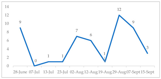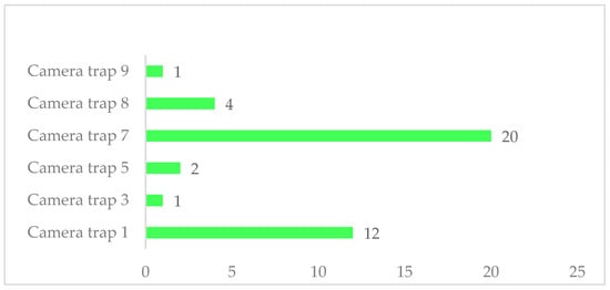 Camera trap “1” recorded a large part of wolves’ movement (25%), which took place on an approximately weekly basis along the path that leads to the grazing area, which was also used by the farmer, as well as horses and cattle herds, to move to the various grazing areas. Wolves were detected less frequently at other camera traps (“3”, “5”, “8”, and “9”). Camera trap “7” represented a little less than half (42%) of all wolf records. The same wolves were being captured by multiple traps on the same night. Intense wolf activity was recorded in the last 10 days of August at trap “7”. In fact, the number of videos showing wolves during the field check on 29 August was 12, the highest number of the entire study period (Figure 6).