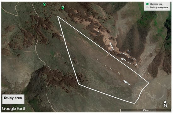 Step (3), regarding the perimeter formation, was carried out using the nine camera traps that were positioned to create a semicircle (Figure 2) around the main grazing area. The angle of view of each camera trap was 120°, while the distance between every camera was several meters (Table 1), and the average altitude was 1553 ± 83 m.