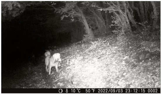 As far as guard dog activity is concerned, videos from camera traps showed a group of two/three dogs wandering at least two times during nighttime, meaning that they did not remain with the herds they were supposed to guard. In one image, one dog from a neighboring farm had a piece of meat in its mouth, which probably was from a nearby carcass of a cow detected by the farmer (Figure 8).