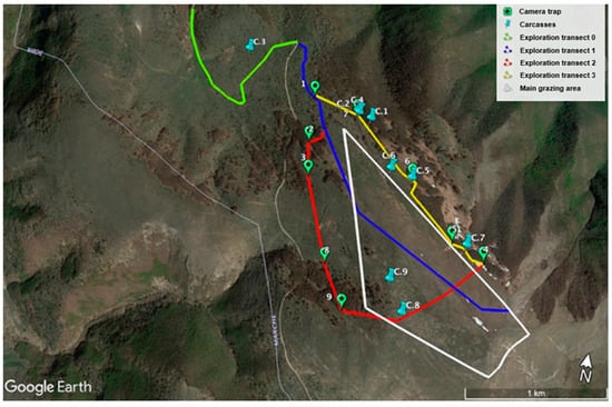 The detection of carcasses and/or remnants of animals was carried out and geolocated using Google Earth. The discovered dead animals were identified, sampled, and removed.