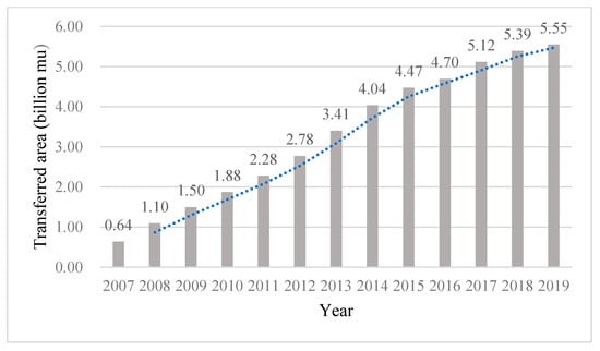 Change in the scale of the farmland transfer market in China from 2007 to 2019. (Unit: 1 mu = 0.067 ha). Source: Public data from the website of the Ministry of Agriculture and Rural Affairs.