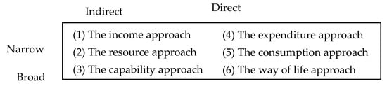 The metrics adopted to quantify well-being vary considerably due to the different ways in which researchers conceptualize well-being. The dominant view of traditional welfare economics is to conceptualize well-being as a utility. It quantifies well-being using equivalent indicators, such as income or expenditure. Other indicators to quantify well-being are subjective well-being, such as quality of life that are widely used in sociology, psychology, and other disciplines. According to Ringen [19], people seek happiness through the choices they make in their lives. Considering the differences between the narrow and broad connotations of well-being defined by welfare economics and sociology, Ringen summarizes six approaches to quantifying well-being (see Figure 2). The capability approach is an indirect way to measure well-being with a broad connotation.