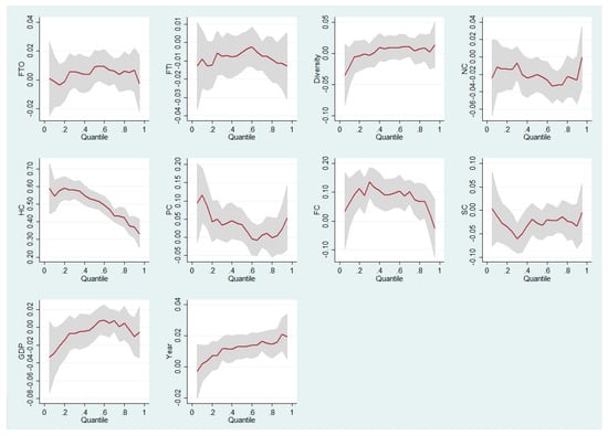 The estimated results from the OLS quantile regression with 0.1, 0.25, 0.50, 0.75, and 0.9 as the dependent variable quantile are shown in Table 7. From the estimated results, there is no significant effect of FTO on the level of household well-being at each quantile, which is consistent with the mean OLS regression results in Table 6. Participating in FTI has a significant negative effect on household well-being only at the highest (0.9) quantile. The estimated coefficients of the independent variables in Figure 4 show that the farmland transfer variables do not change significantly across all quartiles, with no significant upward or downward trend, which indicates that farmland transfer participation has no significant effect on the well-being gap among rural households.