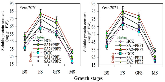 Effects of different treatments on soluble protein content (SP) of soybean during 2020–2021 growing seasons. Note: HCK: Harbin location with control; SA1+PBF1: salicylic acid (5 mL L−1) with pyraclostrobin (3 mL L−1); SA2+PBF2: salicylic acid (10 mL L−1) with pyraclostrobin (6 mL L−1); DCK: Daqing location with control.