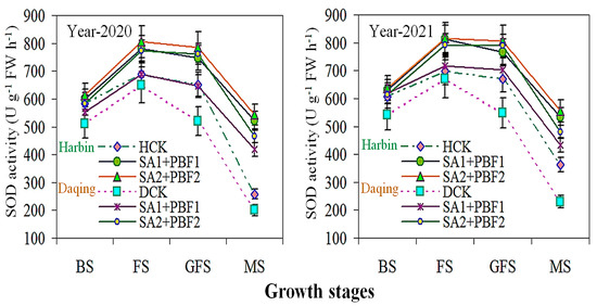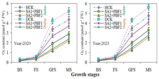 Under the HCK and DCK treatments, the H2O2 and O2− of the soybean were significantly higher than that of SA1+PBF1 and SA2+PBF2 treatments throughout the soybean-growing season in both the Harbin and Daqing study locations (Figure 5 and Figure 6). The H2O2 and O2− of soybean slowly increased from the FS to the GFS and GFS to MS stages. Furthermore, under various salicylic acid and pyraclostrobin levels, the content of H2O2 and O2− increased considerably from the GFS to MS stages. However, the average of two-year data at various growth stages of soybean indicated that in the location of Harbin, SA1+PBF1 and SA2+PBF2 treatments significantly decreased H2O2 by 47.3% and 28.8% compared with HCK treatment, while at the location of Daqing, SA1+PBF1 and SA2+PBF2 treatments significantly decreased H2O2 by 50.4% and 23.0% compared with DCK treatment. Meanwhile, the mean of O2− content at various growth stages of soybean showed that in the location of Harbin, SA1+PBF1 and SA2+PBF2 treatments significantly decreased O2− by 53.2% and 35.6% compared with HCK treatment, while at the location of Daqing, SA1+PBF1 and SA2+PBF2 treatments significantly decreased O2− by 57.3% and 30.8% compared with DCK treatment. At the BS, FS, GFS, and MS stages, the soybean leaves under the HCK and DCK were considerably higher in H2O2 and O2− than in the SA1+PBF1 and SA2+PBF2 treatments. The H2O2 and O2− of the SA1+PBF1 treatment were higher compared with SA2+PBF2 in both the Harbin and Daqing study locations.