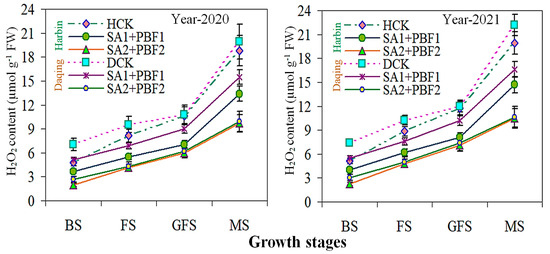 Effects of various treatments on hydrogen peroxide of soybean leaves during 2020–2021 growing seasons.