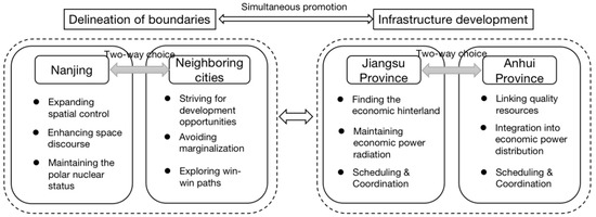 On the other hand, for neighboring cities and their rulers, “entering the MA” means more development opportunities, better expected performance, and greater promotion possibilities [49], and actively “entering the MA” can dampen the threat of being marginalized in the competition for regional spatial development rights. In addition to external boundaries, there are also boundaries within the MA, which depend on the ways in which different development blocks are used. In the NMA, the spatial utilization pattern of “one pole, two zones, four belts, and many clusters” has been defined, and the scaling of different areas has been stipulated. The determination of the internal boundaries came as the result of a mutual game between Nanjing and the neighboring cities, led by the provincial governments of Jiangsu and Anhui, and its conclusion fits into the vision of spatial power development of both parties—a “two-way run” that leads to a win–win situation.