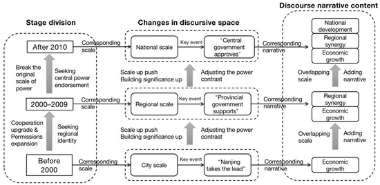 While the construction of the material and organizational space continues to advance, discourse also represents an important power tool in the construction of the NMA. Initially, only economic growth was emphasized, but later, regional synergy and national development narratives were added, and now, a multi-scale overlapping spatial pattern of discourse expression has been formed. On the whole, the construction of the discursive space has gone through three stages: “Nanjing takes the lead”, “the provincial government supports”, and then “the central government approves”. During this process, the positioning and construction significance of the NMA increased, and the contrast in power relations changed (Figure 4).
