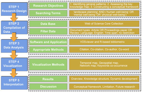 As shown in Figure 1, we proposed a workflow based on the recommended standard workflow for scientometric analysis [], which involves five steps: study design, data compilation, data analysis, data visualisation, and interpretation.