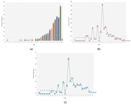 Information on annual publications from 1992 to 2023: (a) total publications; (b) mean total citations per article (MeanTCperArt); and (c) mean total citations per year (MeanTCperYear).