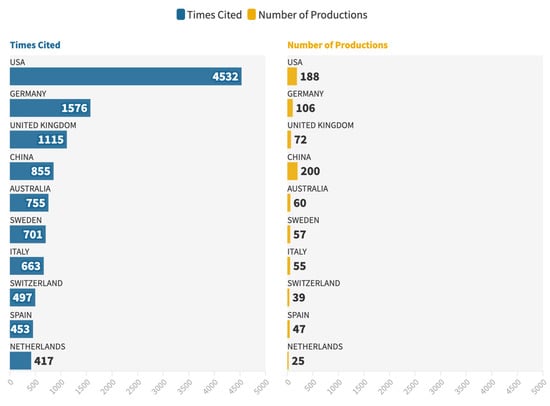 Country scientific production. (left) Times Cited. (right) Number of productions.