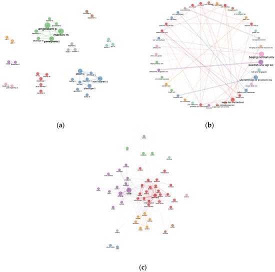Collaboration patterns, (a) authors, (b) institutions, and (c) countries. The same colour of the bubbles shows the same cluster, which has a collaborative connection. The thickness of the line reflects the closeness of the partnership, while the bubble size indicates the number of articles.