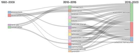 Topic evaluation can aid in understanding how knowledge is transferred across research domains and encourages researchers to identify trends for future studies []. We determined the dynamic development of research topics using Bibliometrix and VOSviewer to analyse and visualise the results, respectively. Based on the annual publishing distributions, we separated the period into three: subperiod one, 1992–2009; subperiod two, 2010–2015; and subperiod three, 2016–present, to help elucidate the trend. The subtle thematic development of these three subperiods is shown in the Sankey diagram (Figure 7). By combining systematic analysis and data visualisation, we found that early research on landscape planning and human well-being mainly focused on large-scale assets such as national parks [,] and protected areas []. Publications in this field rose in subperiod two along with the release of significant policy documents, such as the ELC, and a few global environmental concerns, such as urbanisation and environmental degradation. As subperiod three ended, ecosystem services began to receive more attention, which led to their emergence as crucial content when considering landscape planning, as discussed in Section 3.2.2.