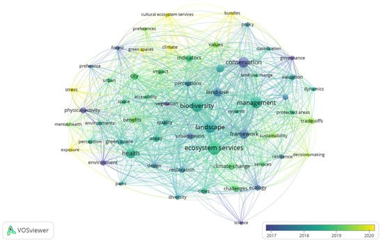 We divided the keywords into three main categories: ecology (ecosystem services, biodiversity, conservation, and climate change); spatial planning (health, land-use, impacts, cities, areas, and urbanisation); and governance (management, framework, indicators, and challenges). Since ‘landscape’ is the primary focus of this research area, we argued that it belongs to all three categories. This result aligns with the assertion that landscape planning must bridge scientific knowledge on ecosystems and socio-spatial systems with changing land-use processes and other factors affecting decision-making in landscape governance [].