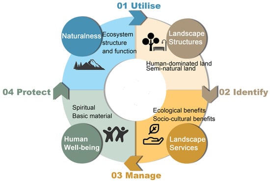 The first step in the cycle involves the use of landscape planning-based methods to translate naturalness into different landscape structures. Notably, we use ‘landscape structures’ here to refer to various types of natural environments shaped by human activity to distinguish these mixed lands from the purely natural. Evidently, ecosystem structure and function imply that the natural environment provides the foundation of Earth’s life support system, and this consensus has been extensively discussed in the literature []. When considering the transformation of natural environments into landscape structures, such as green spaces in urban areas, and semi-natural areas, such as national parks and protected lands that are accessible and directly beneficial to humans, it is crucial to engage in effective landscape planning that connects these two parts while preserving the inherent natural order. As many scholars have highlighted, inconsiderate utilisation and conversions may lead to an unsustainable way of life and the destruction of natural environments []. Therefore, appropriate landscape planning methods, such as functional analysis and valuation before decision-making [,], assigning monetary values to the natural environment [,,], and conducting spatial planning and design based on stakeholder integration, are essential [,].