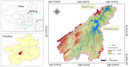 The study area is located in the upper reaches of the second tributary of the Yangtze River, mainly covering Guiyang and Anshan, with a small part of the area located in Qiannan (Figure 1). Within the study area, Hongfeng Lake and Baihua Lake are typical karst deepwater reservoirs. Hongfeng Lake is located in the western suburbs of Guiyang and has a water area of 57.2 km2, an average depth of about 70 m, and a maximum depth of more than 100 m. It is 28 km from Guiyang, the first station on the Guizhou western golden tourism road, with a scenic area of 200 km2. It is a picturesque spot integrating a plateau lake, mountains, karst geomorphology, and minority customs. Baihua Lake has a surface area of about 14.5 km2 and a total reservoir capacity of 1.82 × 108 m3. Its average depth is 10.8 m, and its maximum depth is 45 m. Both lakes are typical karst plateau artificial deepwater lakes and are the main drinking water sources of Guiyang City; hence, their ecological functions and value are very important.
