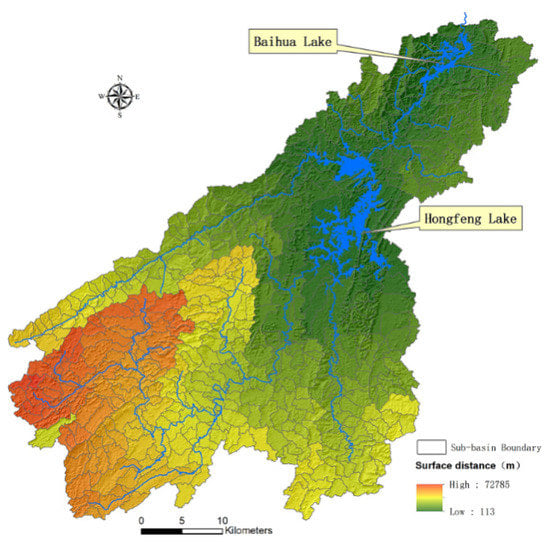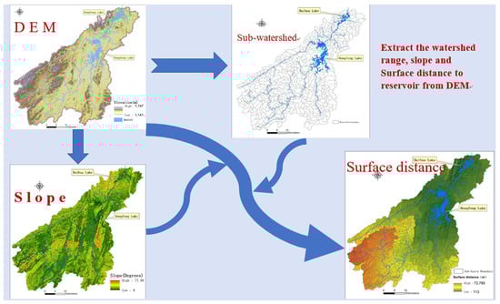 The DEM data were used to obtain the sub-watershed boundary and slope information, and the flow distance analysis tool (FlowDirection) in the hydrology analysis module (Hydrology) of ARCGIS was applied to calculate the flow distance from each image element to the reservoir, with the entire reservoir water surface as the lowest point (outlet). Then, the surface distance from each image element was calculated by combining the slope values, based on which the average surface distance (Distancem) from each sub-watershed to the reservoir was obtained (Figure 2).