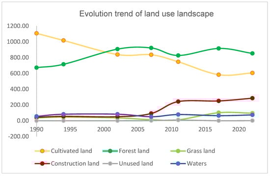 From 1990 to 2017, cultivated land showed a downward trend. Since 2017, however, it has rebounded. Forest land showed an upward trend in general, but there was a period of downward fluctuation around 2010. Construction land showed a general upward trend, especially from 2007 to 2012, when the rate of increase was the fastest, after which it rose more slowly. Grassland also increased at a generally stable rate, although there was a period of decline from 2007 to 2011. The area of water was at a stable level, with a clear decline in 2007. Unused land fluctuated widely from year to year, but the total size was small and relatively stable overall (Table 3 and Figure 3).