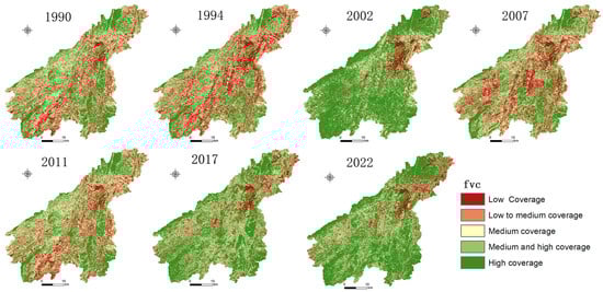 The FVC was calculated based on Landsat5 data (1990, 1994, 2002, 2007, and 2011) and Landsat8-OLI data (2017 and 2022), with geometric correction and atmospheric correction using an image element dichotomous model []. The calculated results were sequentially classified as low cover, low–medium cover, medium cover, medium–high cover, or high cover, and their average cover indicators were calculated in the sub-watersheds as units to participate in the comprehensive evaluation.