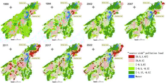 Distribution of pollution loads in the source–sink landscape (1990–2022).