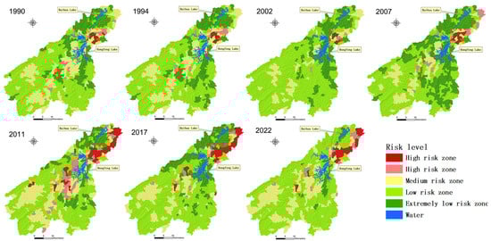 From 1990 to 2022 (Figure 6), the ecological risk in the study watershed increased, followed by a decrease. The ecological risk in the northern part of the watershed changed from extremely low to medium–low, whereas the ecological risk in the southwest was relatively stable, with little change. The ecological risk in the eastern neighboring Baihua Lake watershed gradually increased, transforming from medium–low to high—extremely high. The ecological risk in the southern part also gradually rose from extremely low to medium–low. The ecological risk in the upper part of the Hongfeng Lake watershed showed an increasing then decreasing trend, especially in 2011–2022. The transformation from high and extremely high risk into medium–low risk was evident, and the effect on drinking water source protection was also obvious.