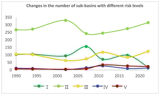Changes in the number of sub-watersheds with different risk levels. Note: I = extremely low risk; II = low risk; III = medium risk; IV = high risk; V = extremely high risk.