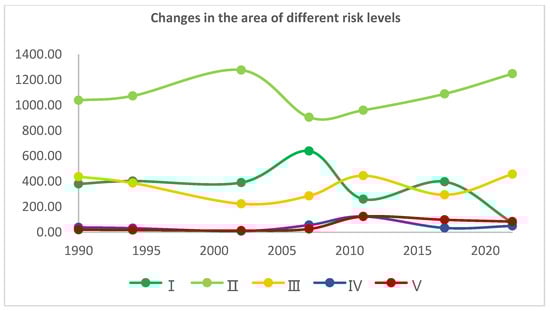 Changes in the area of sub-watersheds with different risk levels. Note: I = extremely low risk; II = low risk; III = medium risk; IV = high risk; V = extremely high risk.