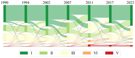 Considering the risk-level classifications of the study, extremely low risk and low risk focus on sink landscape risk, which has a blocking effect on the ecological risk of reservoirs in a watershed, while medium risk, high risk, and extremely high risk focus on source landscape risk. Therefore, according to the migration of ecological risks in different periods, the changes in the sink landscape risk indicate a growth trend, as shown by the transformation of 252 sub-watersheds from extremely low risk into low risk and of 153 sub-watersheds from low risk into extremely low risk. This illustrates that the sink landscape risk had an upward trend. Meanwhile, the source landscape risk changed from medium risk to high and extremely high risk in 48 sub-watersheds and from high and extremely high risk to medium risk in 34 sub-watersheds. This confirms that the risk level of the sink landscape also had a gradual upward trend. A migration from sink landscape risks (I and II) to source landscape risks (III, IV, and V) was observed in 154 sub-watersheds, while 119 sub-watersheds were involved in the migration from source landscape risks (III, IV, and V) to sink landscape risks (I and II), indicating that the migration of sink to source was greater than that of source to sink and that the overall ecological risk of the source–sink landscape was increasing (Figure 9).