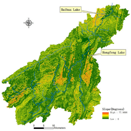 The two lakes belong to the same watershed, which is close to Guiyang City. Part of the watershed has been incorporated into the urbanization development direction of Guiyang. It is located in the economically active area of the province, which is exerting great pressure on the water environment. Through joint management by the government and society in recent years, point source pollution around the reservoirs has been effectively controlled, and water quality has improved significantly. Nevertheless, risks still exist, such as garbage dumping around lakes, residential domestic water discharge, and non-point source pollution. In the management and treatment of non-point source pollution of drinking water sources, the difficulty lies in finding the key zone of treatment, and the spatial location of the risk zone needs to be identified. The water quality risk of a lake reservoir occurs in the water, but the source risk is mainly in the shore watershed. Therefore, in this study, we used the natural watershed boundary to determine the study area of the watershed.