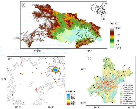 Topography of Hubei Province (a) and night-time light of Jianghan Plain (b). The solid black line delineates the Wuhan area. Land use and distribution of stations in the Wuhan region (c). The unit of the terrain is m, and the black line indicates the location of Wuhan in (a); the solid grey line in (b) is the 100 m elevation contour line, and the thin black solid line in (c) delineates the Wuhan urban areas based on night-time lighting. The dots in (c) represent 76 stations in Wuhan, with red dots for urban stations, blue dots for rural stations, and black dots for the rest.