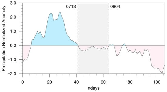 To define the summer dry period, the time series of daily precipitation is obtained by smoothing five points from 1 June to 15 September (Figure 2), using the reanalysis data of precipitation in the middle and lower reaches of the Yangtze River (27.5–32.5° N, 112–123° E) during 1981–2010. The daily precipitation was analyzed with standardized anomalies. The summer dry period begins with negative daily precipitation for 7 consecutive days and ends with daily precipitation greater than zero for 1 day. Therefore, in this paper the summer dry period is defined to run from 13 July to 4 August (Figure 2).