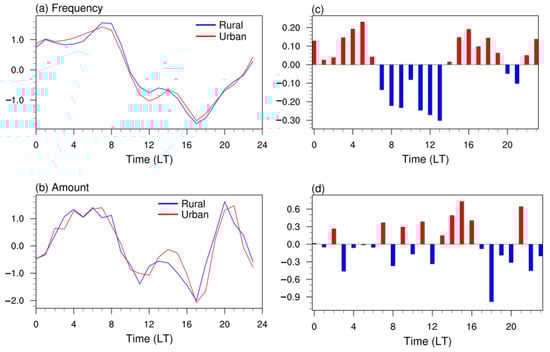 Furthermore, Figure 3c,d shows the diurnal urban-rural differences in the frequency and average amount of hourly rainfall. During 2200–0600 LT and 1400–1900 LT, a higher frequency appears over Wuhan urban areas than rural areas; however, there is no obvious diurnal urban-rural difference in the average amount.