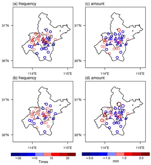 Spatial distribution of rainfall frequency (a,b), average amount (c,d) anomaly in Wuhan area (a,c) and night-time (0000–0600 LT) (b,d), respectively. The units of rainfall frequency and amount are times and mm; the urban stations are shown as triangles, and the rural stations are shown as hollow circles; the thick black solid line delineates the Wuhan area, and the thin black solid line delineates the urban areas.