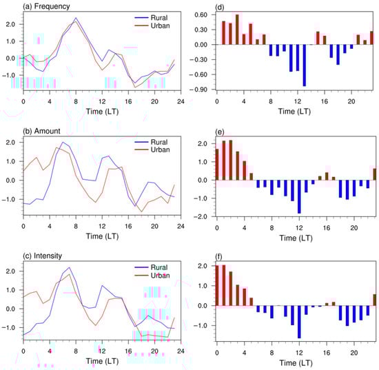 The diurnal variations in SDR frequency (a,d), average amount (b,e), and average intensity (c,f) at urban and rural stations (a–c), and their differences between urban and rural stations (d–f). Red/blue bar indicates the positive/negative difference, respectively.