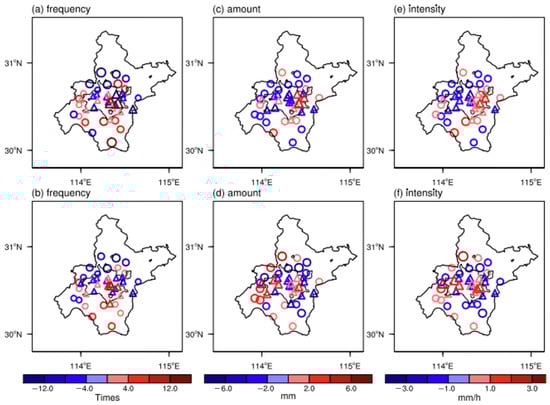 Spatial distribution of SDR frequency (a,b), average amount (c,d), and average intensity (e,f) anomaly in Wuhan area (a,c,e) and night-time (0000–0600 LT) (b,d,f). The units of rainfall frequency, amount, and intensity are times, mm, and mm/h, respectively; the urban stations are shown as triangles, and the rural stations are shown as circles; the thick black solid line delineates the Wuhan area, and the thin black solid line delineates the urban areas.